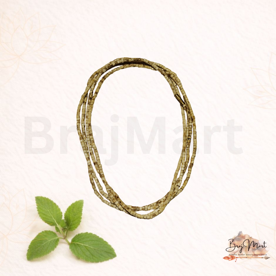 Kharad Tulsi Kanthi Mala – Three Round is a sacred and traditionally handcrafted neck mala made from authentic Tulsi wood beads. Designed in a three-round (triple-layer) style, this kanthi represents deep devotion, spiritual commitment, and strong faith in the Vaishnav tradition.Tulsi is considered extremely sacred and is especially dear to Lord Krishna and Lord Vishnu. Wearing a Tulsi kanthi is believed to offer spiritual protection, inner peace, and purity of mind. The three-round design symbolizes stronger spiritual discipline and a deeper connection to bhakti.